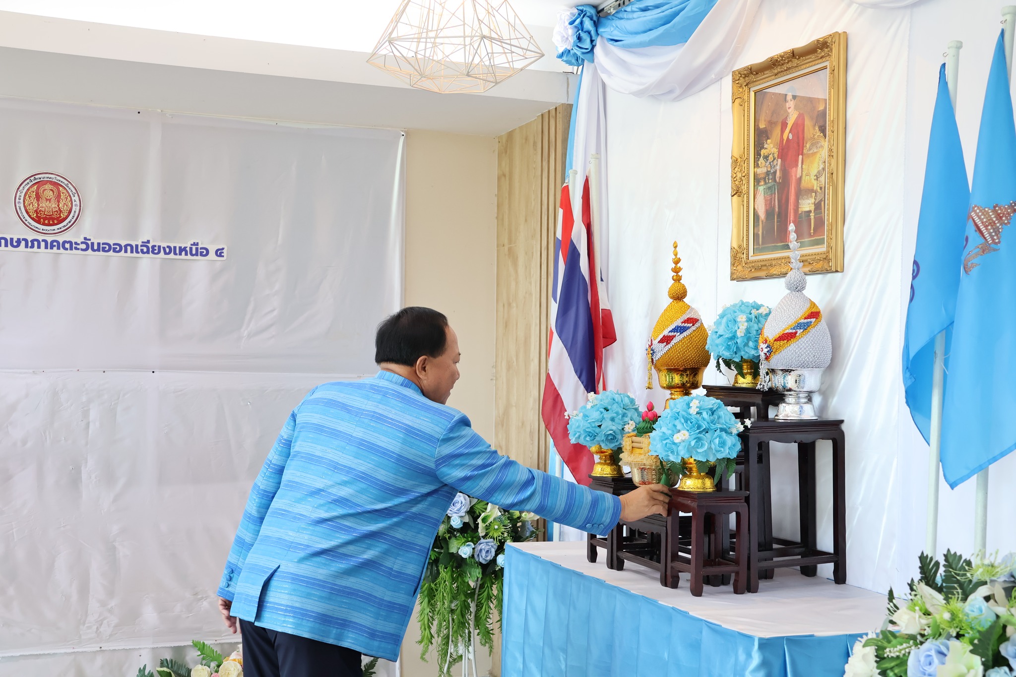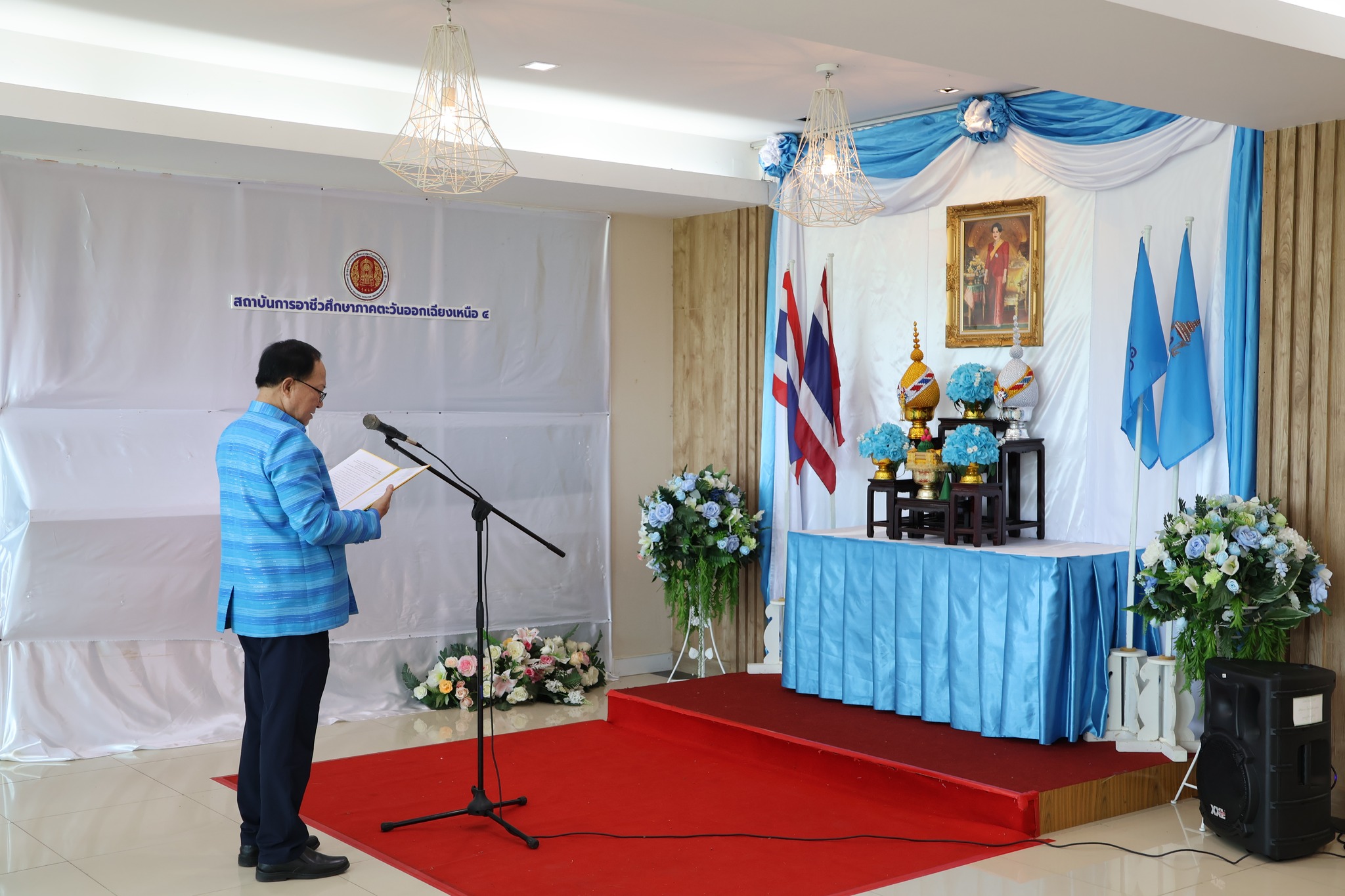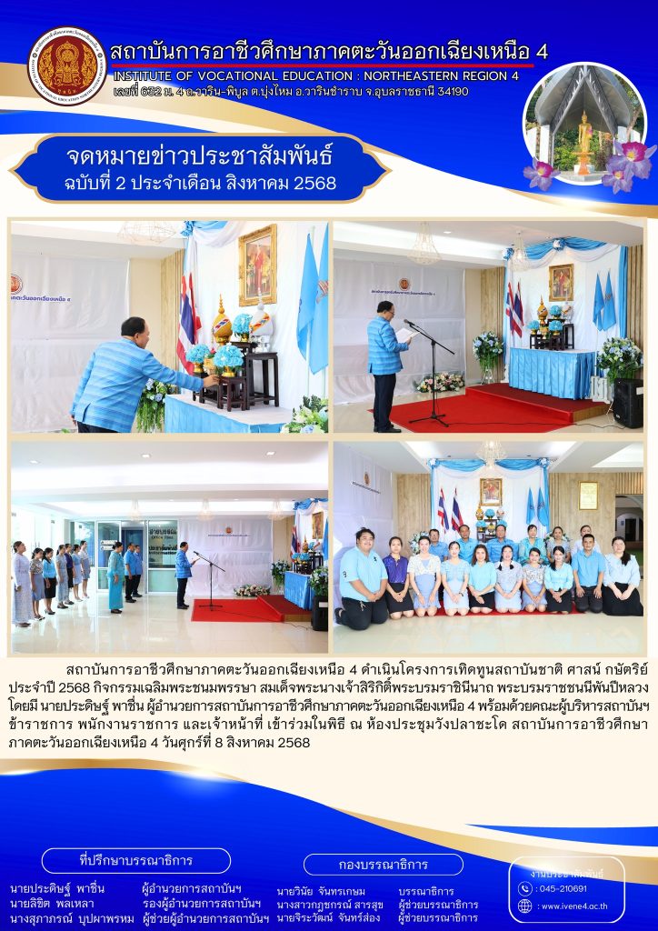 สถาบันการอาชีวศึกษาภาคตะวันออกเฉียงเหนือ 4 ดำเนินโครงการเทิดทูนสถาบันชาติ ศาสน์ กษัตริย์ ประจำปี 2568 กิจกรรมเฉลิมพระชนมพรรษา สมเด็จพระนางเจ้าสิริกิติ์พระบรมราชินีนาถ พระบรมราชชนนีพันปีหลวง โดยมี นายประดิษฐ์ พาชื่น ผู้อำนวยการสถาบันการอาชีวศึกษาภาคตะวันออกเฉียงเหนือ 4 พร้อมด้วยคณะผู้บริหารสถาบันฯ ข้าราชการ พนักงานราชการ และเจ้าหน้าที่ เข้าร่วมในพิธี ณ ห้องประชุมวังปลาชะโด สถาบันการอาชีวศึกษาภาคตะวันออกเฉียงเหนือ 4 วันศุกร์ที่ 8 สิงหาคม 2568 💙💙💙